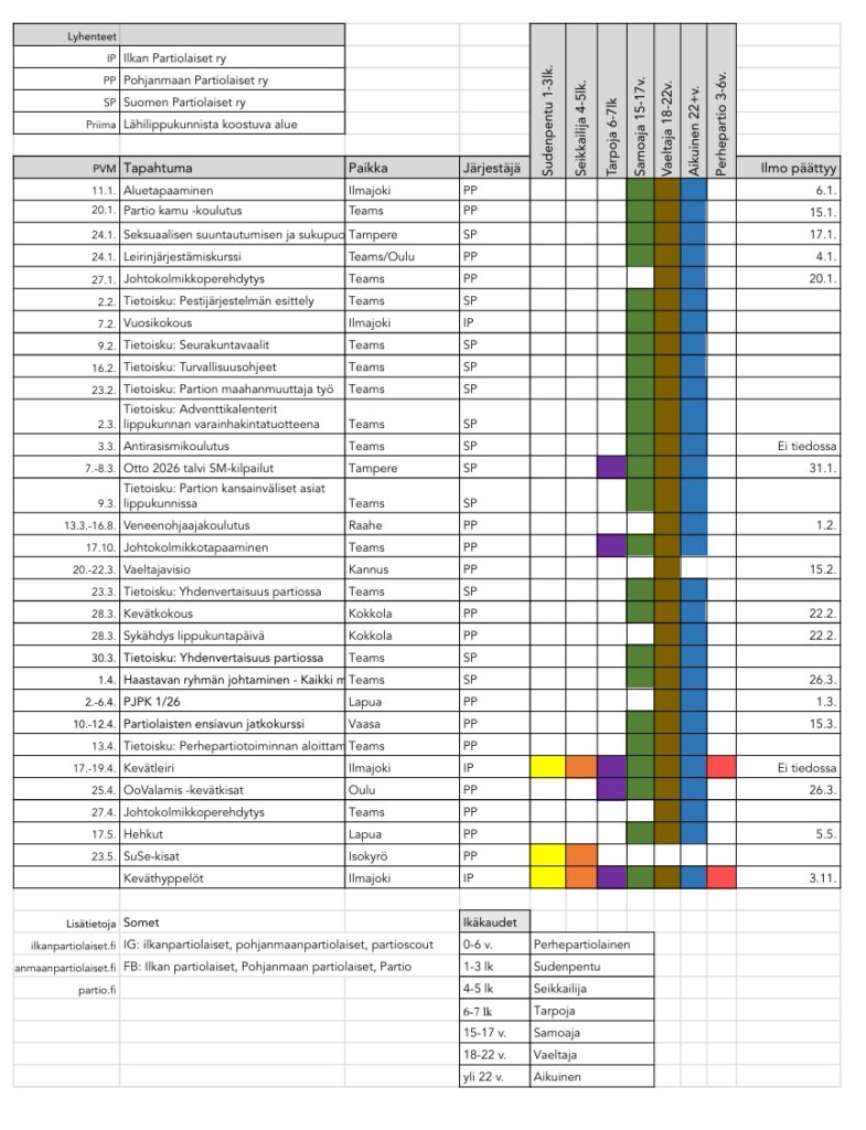 Tapahtumakalenterista näet partiotapahtumat ja koulutukset, joita tulevan syksyn aikana on tulossa. Kalenterissa näkyy Suomen Partiolaisten, Pohjanmaan Partiolaisten, Priiman sekä Ilkan Partiolaisten järjestämät tapahtumat. Näet tapahtumakalenterista myös sen, keitä tapahtumat koskevat. Lisätietoa tapahtumista saat osoitteesta: pohjanmaa.partio.fi.